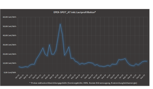 - EPEX-SPOT AT-Base = durchschnittlicher Wert aller EPEX-SPOT AT-Base Preise des ausgewiesenen Monats (wird im Folgemonat berechnet)