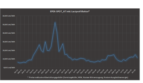 - Lastprofilfaktor = beträgt 1,06 (Bewertung anhand der synthetischen Lastprofile laut APCS (https://www.apcs.at/de/clearing/technisches-clearing/lastprofile) im Verhältnis zum Durchschnitt aller Spotpreise).